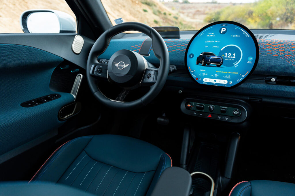 Само дългия път може да разгърне удоволствието от осемте избираеми режима MINI Experience с различни настройки на окачването: Go-kart, Vivid, Core, Green, Timeless, Balance, както и Trail. Режимът Go-Kart стартира с вихрен звук и покана за по-спортно шофиране. Дисплеят става червен, а кормилното управление по-директно, спирачната система реагира мигновено. Усещането за картинг е невероятно. Под кръглия дисплей са разположени аналогови превключватели с бутони за позиция на паркиране, селекторът на автоматичната скоростна кутия, въртящият се бутон за стартиране на електромотора, бутонът за избор на режимите на движение и бутон за пускане и спиране на аудиосистемата.