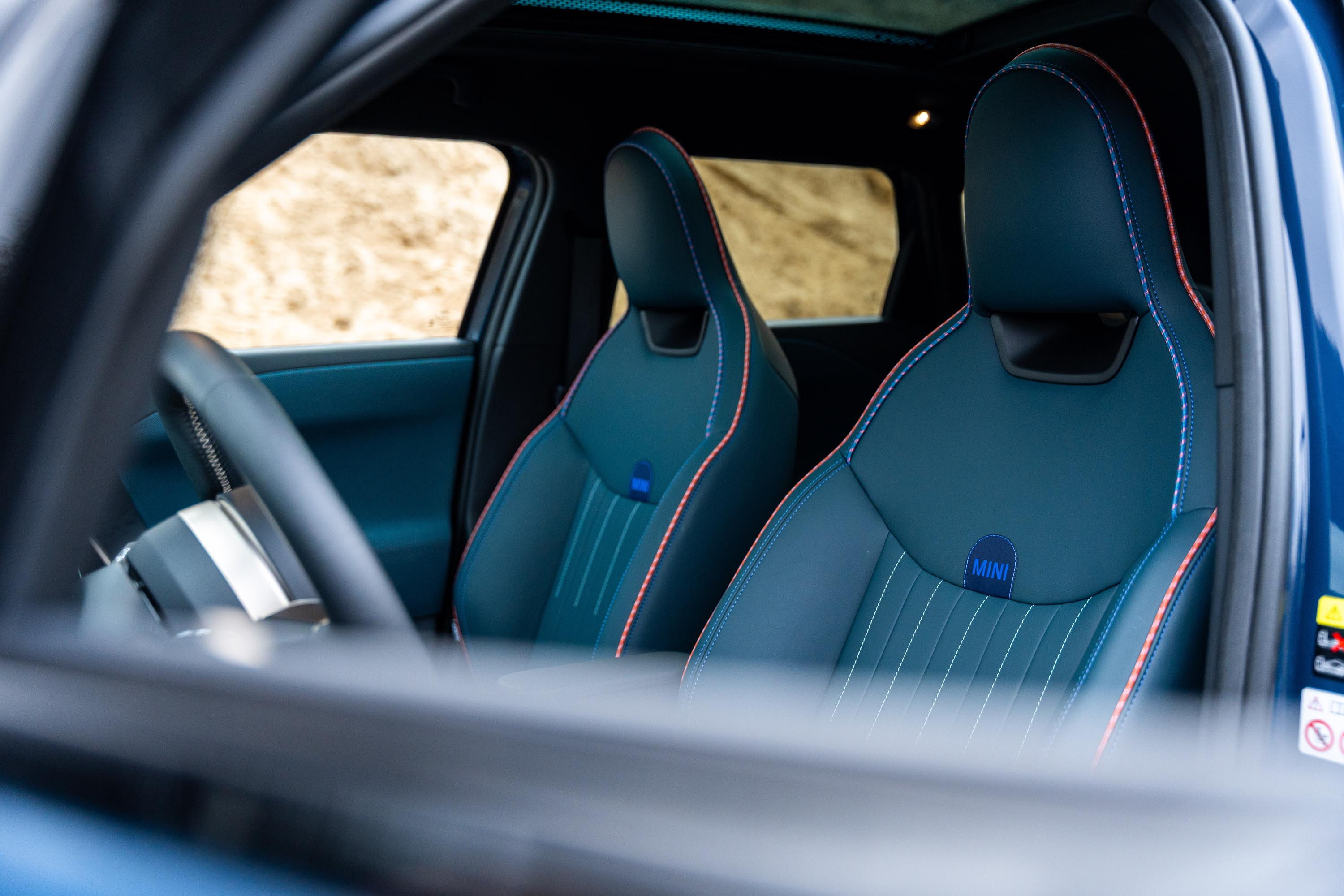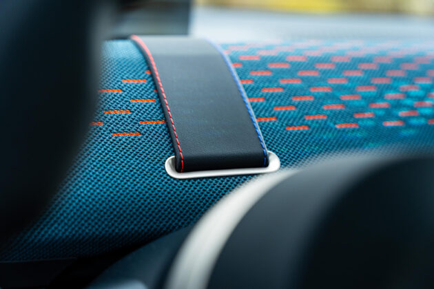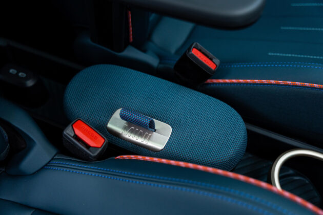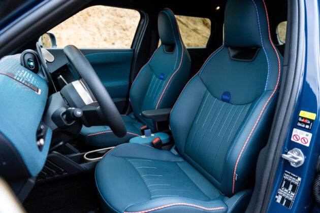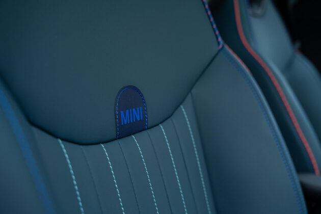В най-високото оборудване Favoured, което имахме удоволствието да споделим, арматурно табло е покрито с двуцветен текстилен плетен материал, чийто „дупки“ на плетката през нощта светят, благодарение на амбиентното осветление в купето, което може да се сменя в различни цветове. Предните удобни седалки имат добра странична и регулируема лумбална опора. Има и две поставки за напитки между предните седалки, а зад тях се намира малка кутия с капак за съхранение на вещи. Има и симпатична жабка, в стила на MINI. Багажникът e с обем от 300 литра, който може да се увеличи до 1005 литра при сгънати задни облегалки в съотношение 60:40.