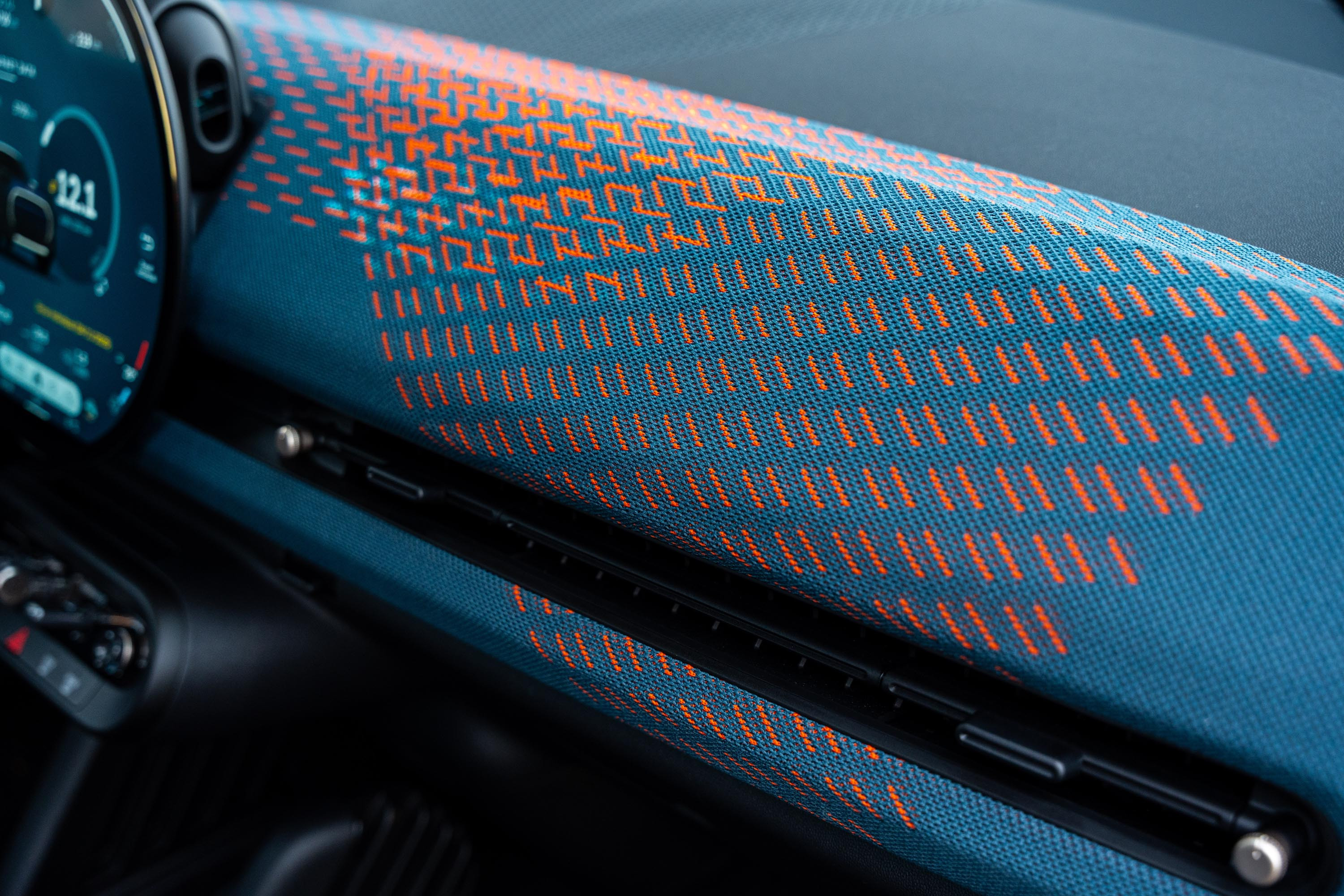 Особено интересен е интериорът на новото MINI Aceman. Няма пътник или шофьор, който да остане безразличен. Всеки влязъл в купето първо пипа текстилния плетен материал, с който е покрита голяма част от арматурно табло, толкова е привличащ,  че някак си естествено всички посягат към него. Следващият небивал интерес естествено е познатият от Cooper и Countryman кръгъл OLED сензорен дисплей с диаметър 240 мм, разработен съвместно със специалисти на Samsung.