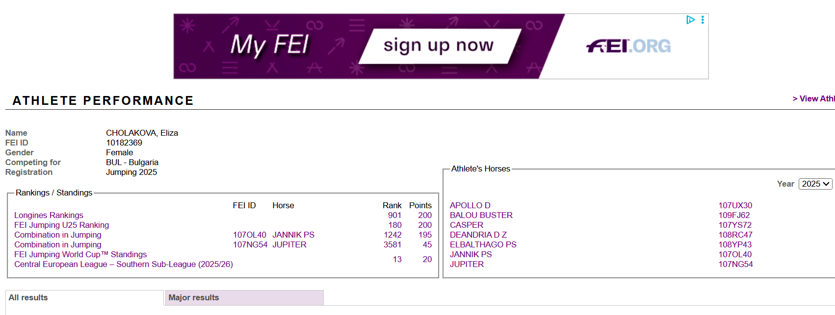 Eлиза Чолакова е най-високо класираният български ездач в Световната класация на Longines  FEI