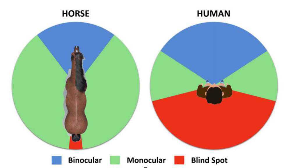Човешките зеници са кръгли, което ни дава зрително поле, което е толкова високо, колкото и широко. Конете обаче, с хоризонтално разположените си зеници, имат ограничено вертикално зрение и не могат да виждат добре над главите си, така че зрителното им поле е още по-ограничено, когато главите им са наведени.Единствените слепи петна, от които конете не получават зрителен образ са под носовете им и зад задните им крайници. Предното сляпо петно е точно под главата, непосредствено пред челото и под тялото на коня. Той не може да види какво яде – тревата, която пасе, или зърното в яслата, ръката, която гали кадифената му муцуна или му подава лакомство и се случва да има затруднения да хване парченцето морков или ябълка. В такива случаи той ги търси на сляпо с помощта на мустаците си. От естетическа гледна точка, ние често прибягваме до премахване на окосмяването по муцуната на конете, но така ги лишаваме от важни за тях сензори. Тези тактилни косми са много важни сензорни органи, които помагат на конете да се ориентират в слепите зони и да взаимодействат с околната среда. С премахването им, ние ги лишаваме от тази възможност и това води до повишена тревожност. По тази причина през 2021 г. Международната Федерация по Конен спорт (ФЕИ) забрани премахването им и много национални федерации, свързани с конните спортове, последваха този пример.Ако човек е застанал пред главата на коня и вдигне ръката си внезапно, на коня му се струва, че тя се появява от нищото. Ако сложите бариер или нещо друго на земята близо до предните му крака, докато конят стои неподвижно и не е проследил обекта чрез местене на главата си, той няма да е наясно, че там вече има препятствие на пътя му.