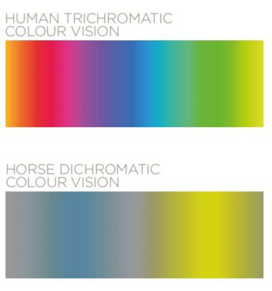 Конете лесно се заслепяват от ярка светлина, но виждат по-добре при слаба светлина. В сравнение с хората, те имат по-добро нощно зрение. Това се дължи на т. нар. тапетум луцидум -светлоотразителен слой, разположен зад ретината, който подобрява зрителната чувствителност при условия на слаба светлина. Тапетумът действа като огледало, връщайки светлината през ретината, като дава на фоторецепторите втори шанс да уловят светлина, но отраженията също така размазват изображенията, намалявайки разделителната способност. Очите на конете не са способни да правят бърз преход между светли и тъмни места. Това обяснява защо понякога не са склонни да влизат в тъмни места, особено ако са им непознати. Ретината е основният определящ фактор за зрението. Окото обработва светлината, възприема цветовете и вижда в тъмното чрез клетки в ретината, наречени конуси и пръчици. Конете могат да виждат само две от видимите дължини на вълните в светлинния спектър, защото имат само синьо-чувствителни конусовидни клетки и зелено/жълто-чувствителни конусовидни клетки. По този начин те виждат синьо, зелено и вариации на двата цвята, но не виждат червено или нюанси на червено. Зелените и червените цветове не са много различими за тях. Когато гледат червено, конете виждат земен цвят с блед жълт и син оттенък. Въпреки че конете могат да виждат синьото и жълтото като отделни цветове, когато са представени със синьо-жълто, изображението се възприема като сиво или бяло. Тъй като конете имат само два цветни рецептор а, ще има няколко комбинации от дължина на вълната и интензитет на светлината, които ще предизвикат еднакви съотношения на реакция в рецепторите и в резултат на това различните цветове ще изглеждат подобни един на друг. Наблюдения от състезания по прескачане на препятствия допълнително разкриват, че едноцветните препятствия водят до повече грешки от тези с два контрастни цвята, което потвърждава значението както на цветовите, така и на интензитетните контрасти.Знанията и по-доброто разбиране на това как конете възприемат зрително средата, в която ги поставяме, особено при различни условия на осветеност, са полезни и много важно условие за подобряване на тяхното благополучие, по-безопасни взаимодействия между човек и кон, както и по-голяма успеваемост в обучението и подготовката.