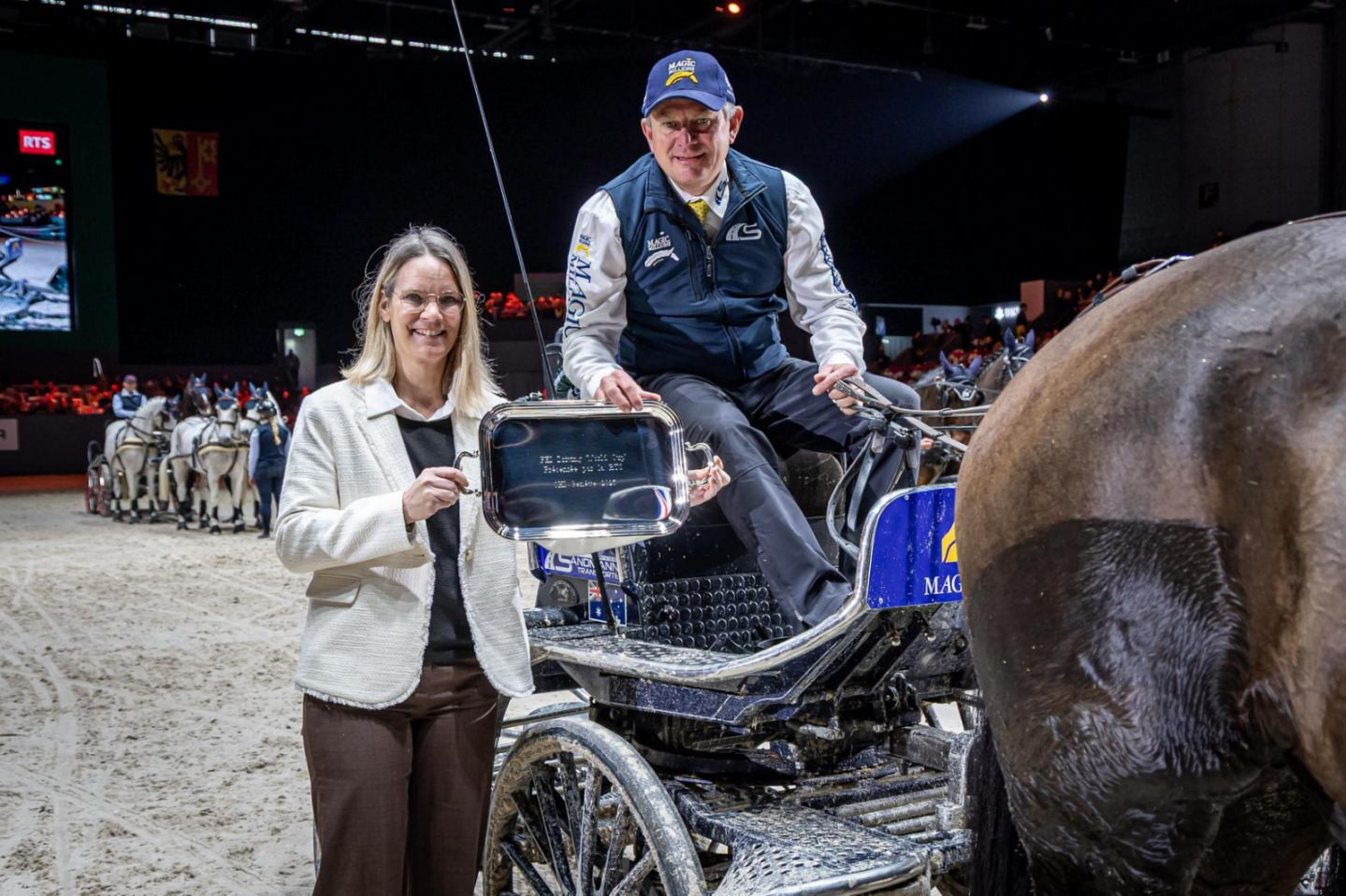 Изправен пред най-силната си конкуренция досега в сериите FEI Driving World Cup™ 2025-26/ Управление на впрягове – кръг от Световна купа, Бойд Ексел (Австралия) изпревари съперниците си и спечели петата си победа от пет събития. Въпреки че Дрийс Дегрик (Белгия) беше в отлична форма и постигна две по-бързи обиколки, опитът на Бойд му осигури преднина, когато беше от значение в двата стартови етапа на петия етап в Женева (Швейцария), и той уверено спечели Световната купа в неделя с време 153.06.