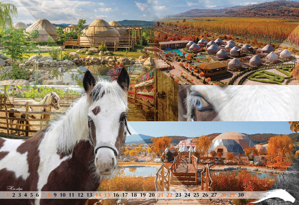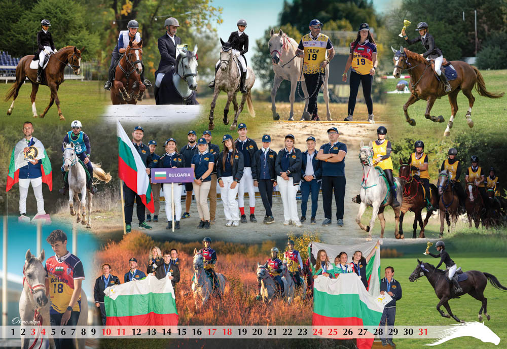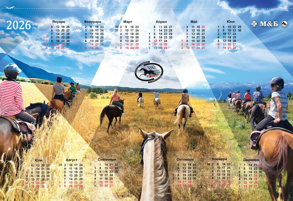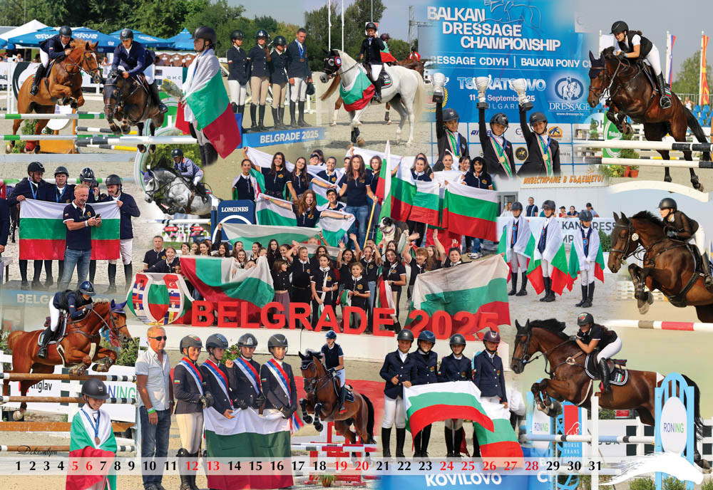 Октомври и декември от календара с коне за 2026 година подобаващо за имиджа на БФКС показват ездачите с победи у нас и в чужбина от всичките класически конни дисциплини, а ноември е отреден на най-новата конна база у нас с еко селище Денгри.