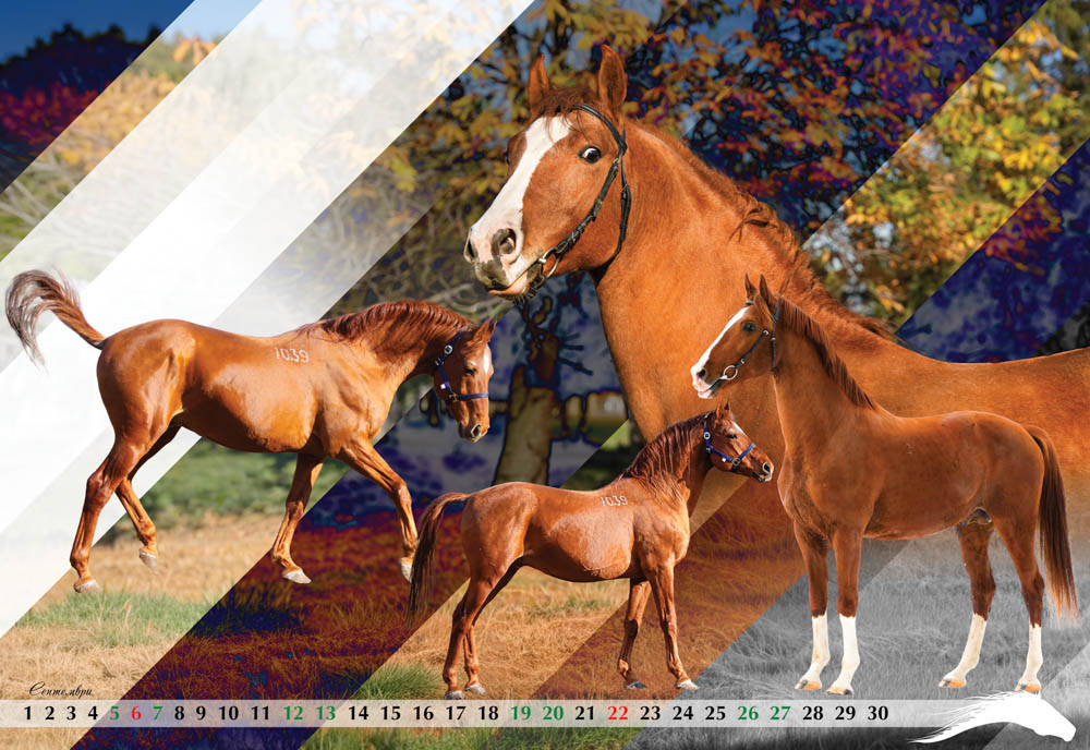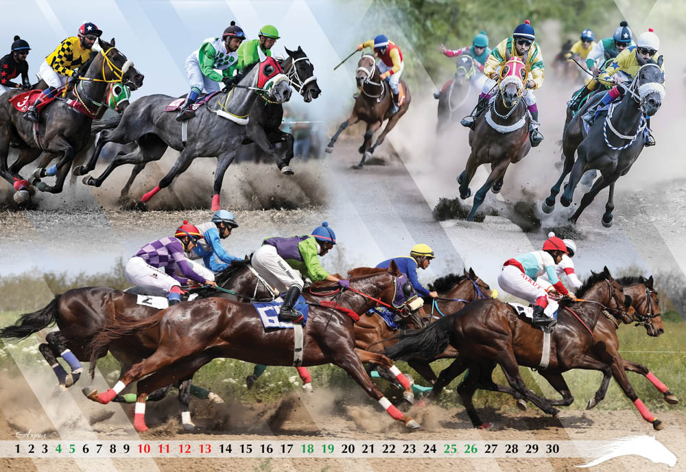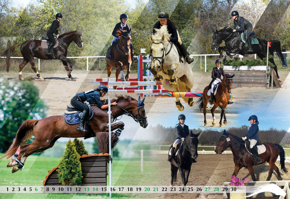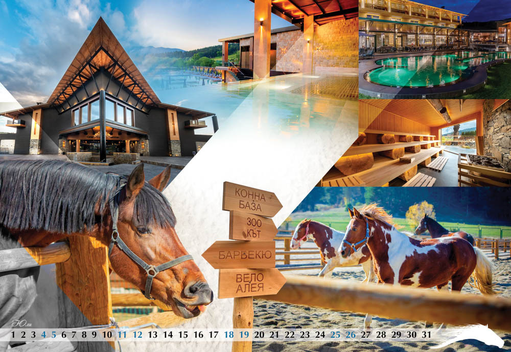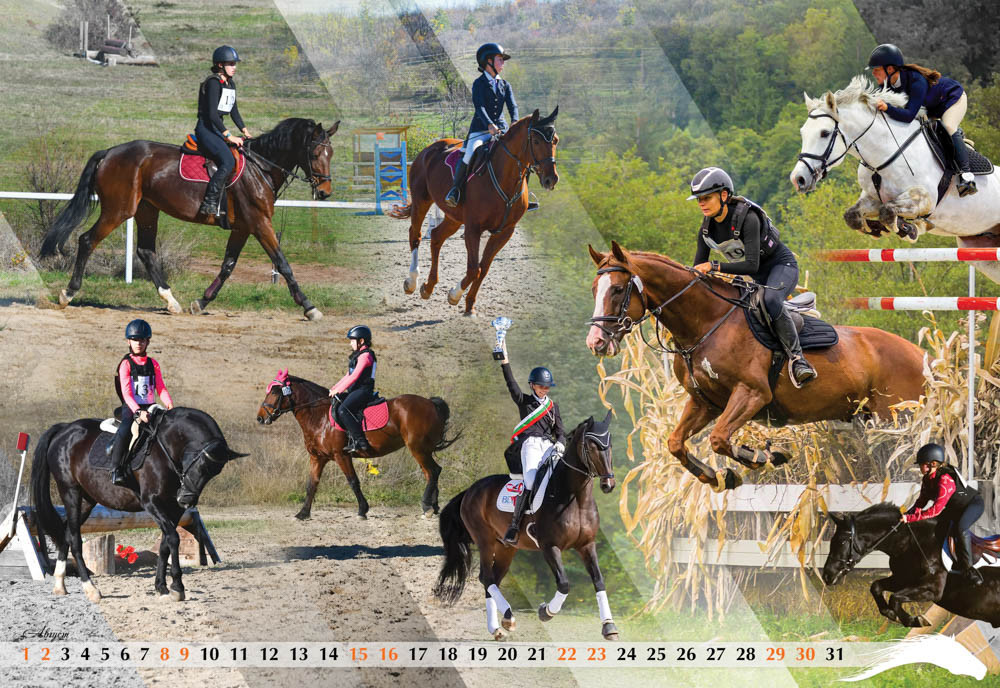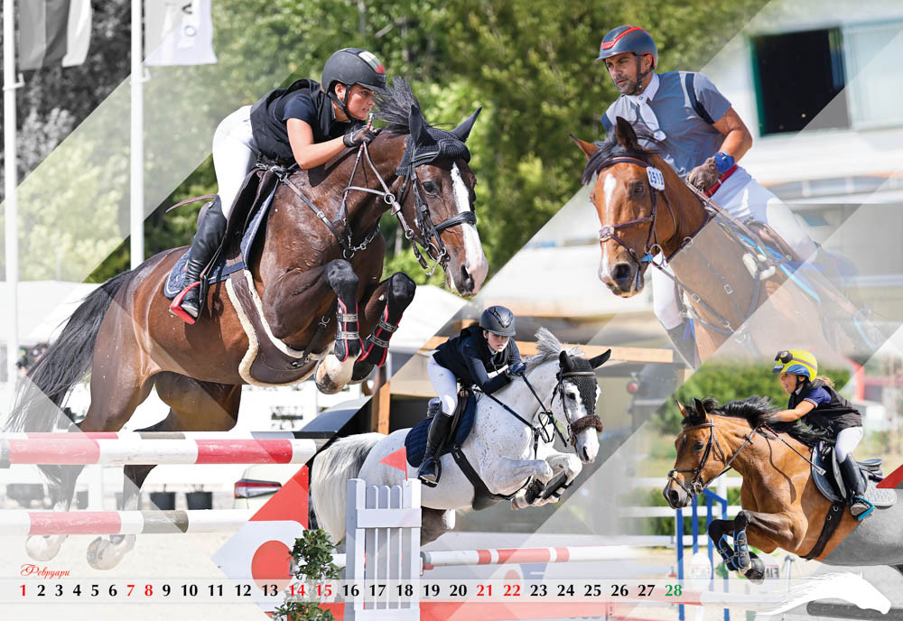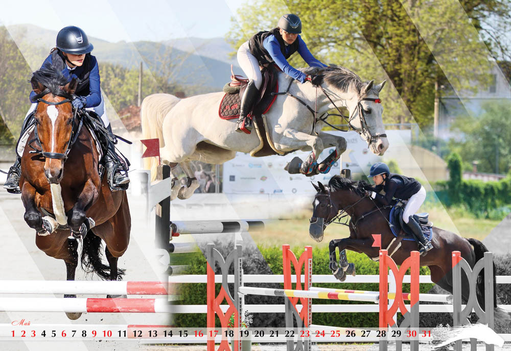 Четвъртата страница от календара е с енергията на беговите коне от Чистокръвна Английска порода и най-добрите фуражи без ГМО – Geby. Май месец е за дългогодишен партньор на конния спорт у нас в лицето на фирма Optix, а юни посреща възпитаниците на спортно училище във Велико Търново и победите им в конния спорт.