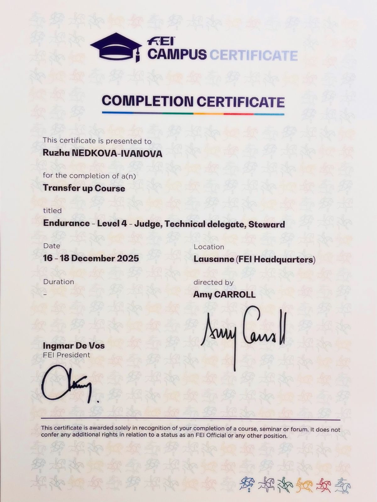 През 2025 г. се проведе конкурс за международни съдии към ФЕИ за 4-то най-високо ниво. В подбора e и българският съдия в дисциплината издръжливост в конния спорт Ружа Недкова-Ианова. По покана от ФЕИ Ружа взима участие в курса, който продължава повече от шест месеца и включва изпит за владеене на английски език, решаване на казуси по дисциплината, онлайн интервю и тридневен курс в централата на ФЕИ в Лозана, Швейцария.