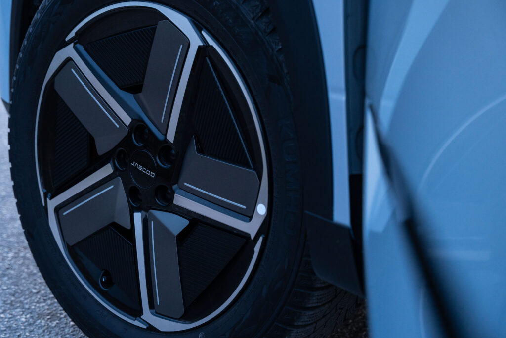 Визията е подсилена от голяма предна радиаторна решетка с лого на JAECOO (добър знак за разпознаваемост, защото и в момента се разминаваме с доста нови модели, които трудно се разбират каква марка са). Класически изцяло LED фарове, големи арки на колелата, с 19-инчови колела с алуминиеви джанти, с 200 мм пътен просвет, лайсна в задната част с интегрирани светлини и отново фирменото лого. Дръжките на вратите са прибиращи се – акцент типичен за премиум автомобилите.